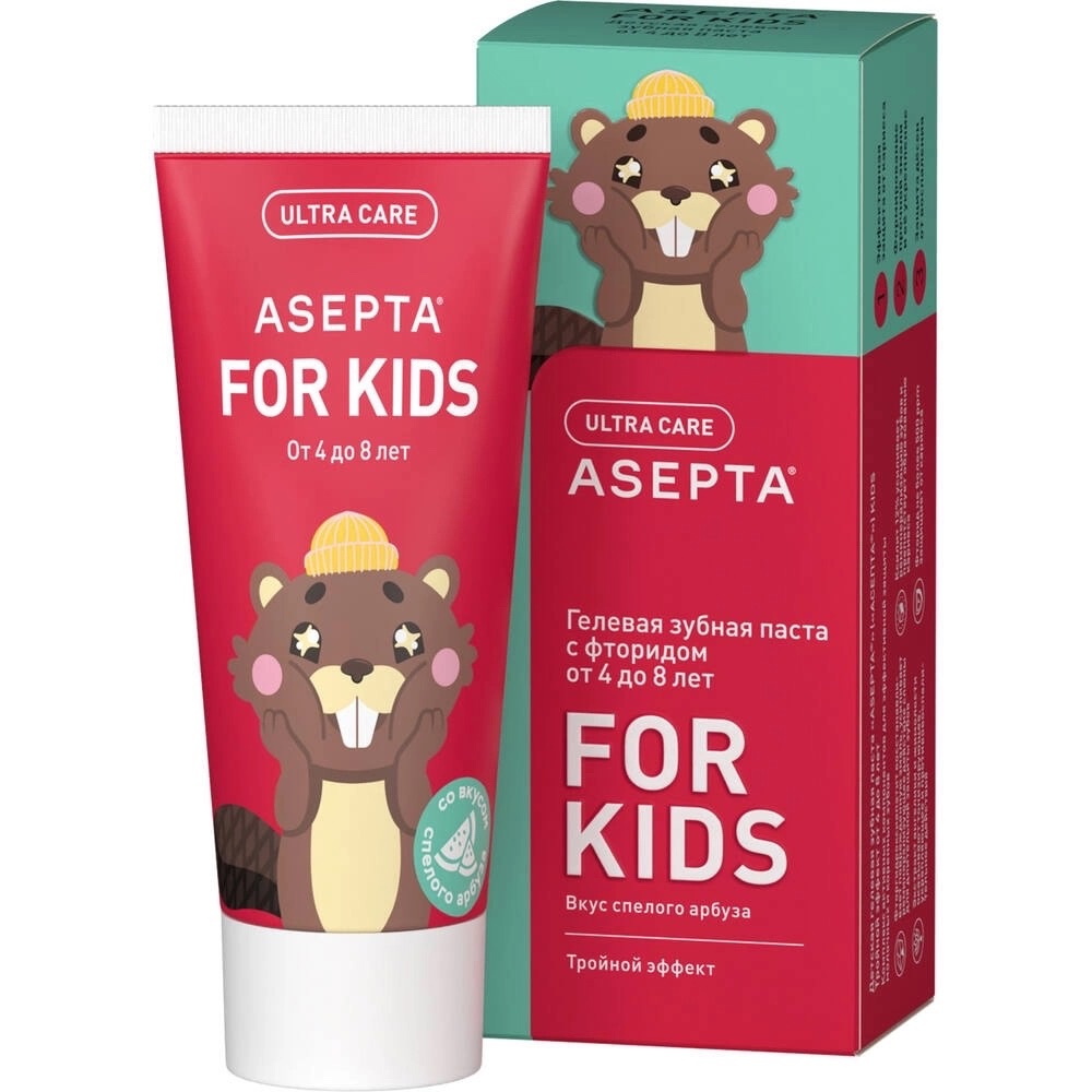 АСЕПТА KIDS «Тройной Эффект» – это зубная паста со вкусом спелого арбуза для эффективной гигиены полости рта и профилактики кариеса у детей от 4 до 8 лет.